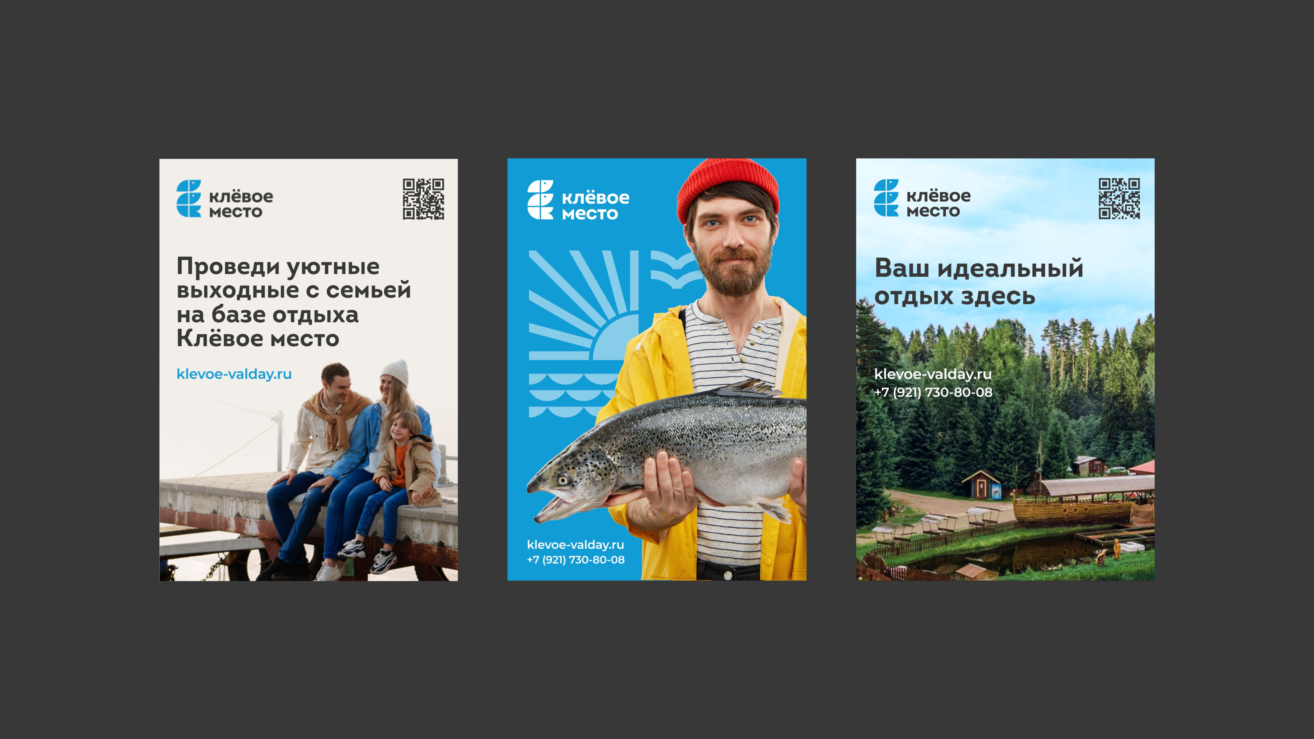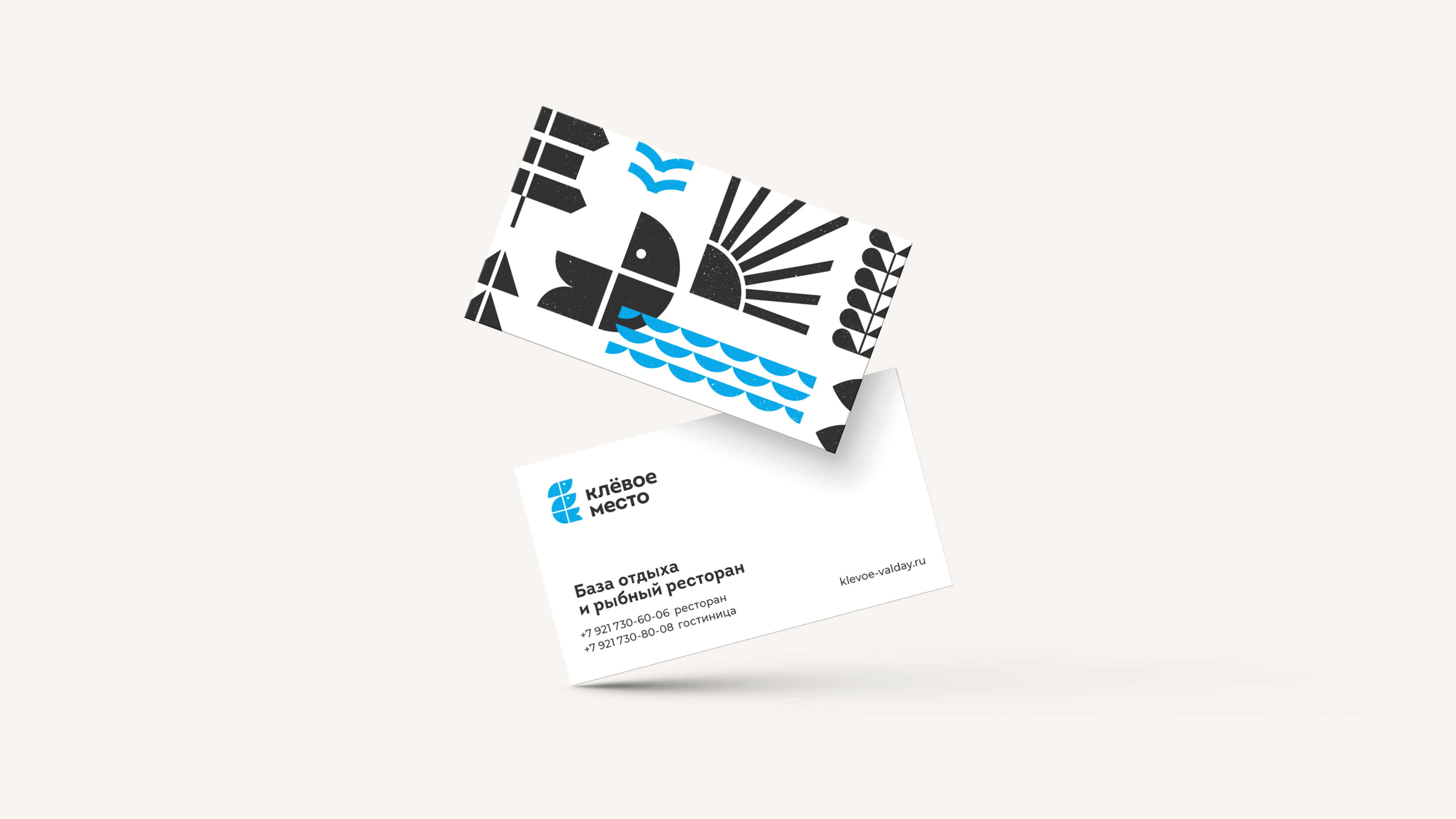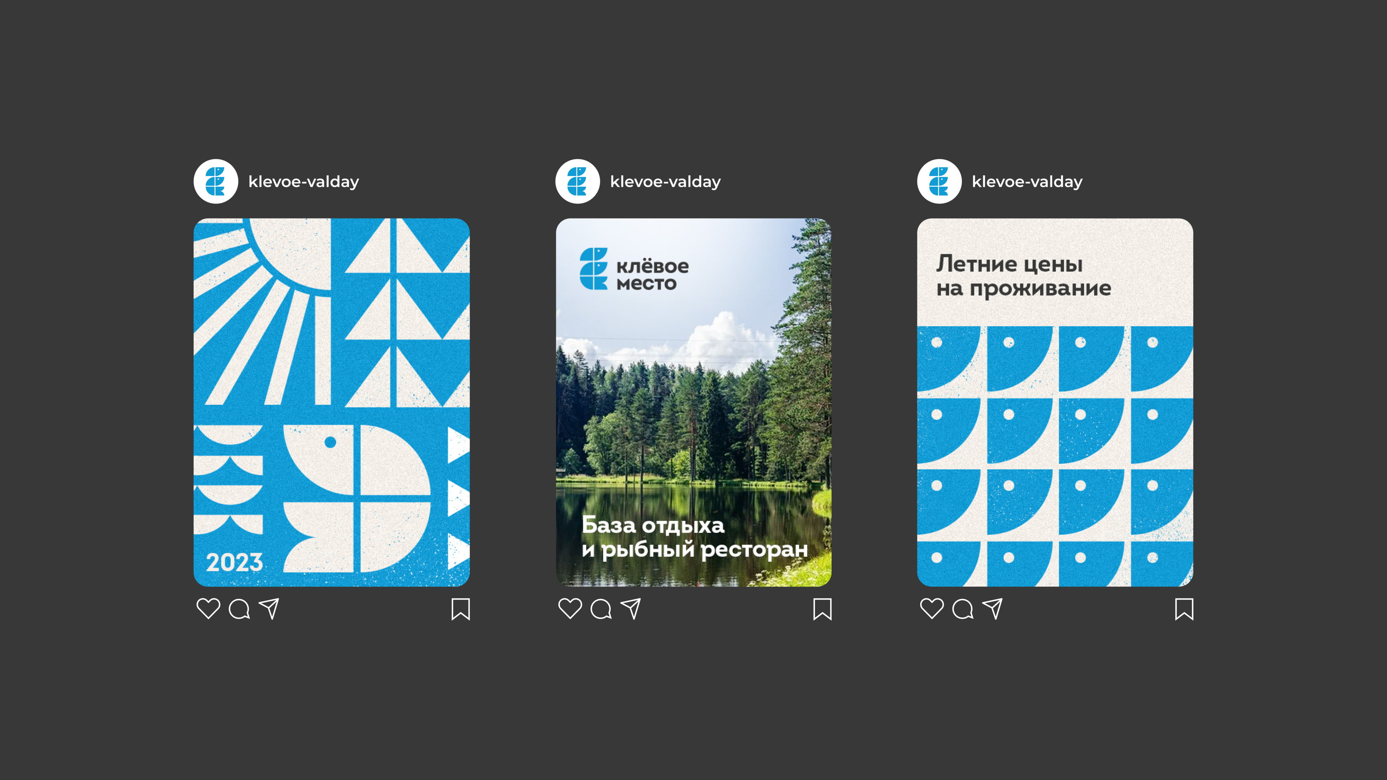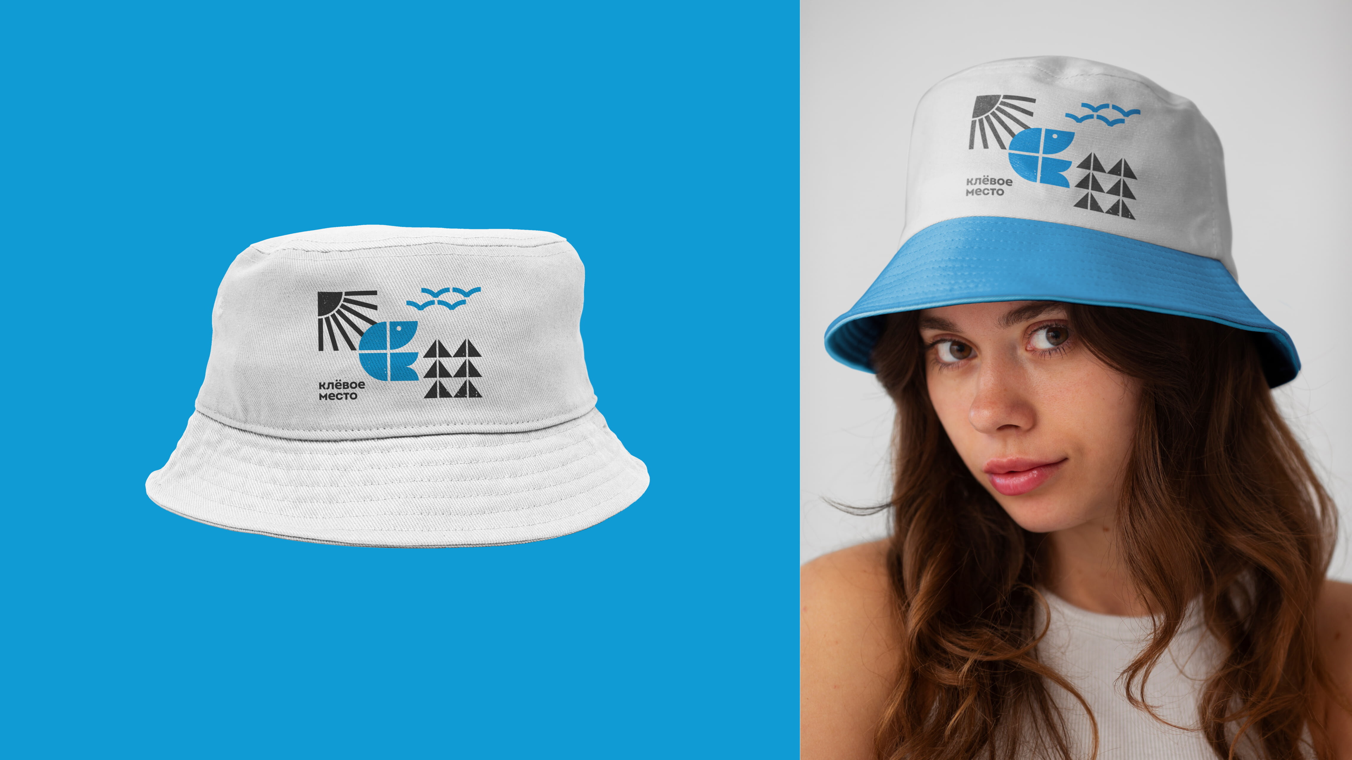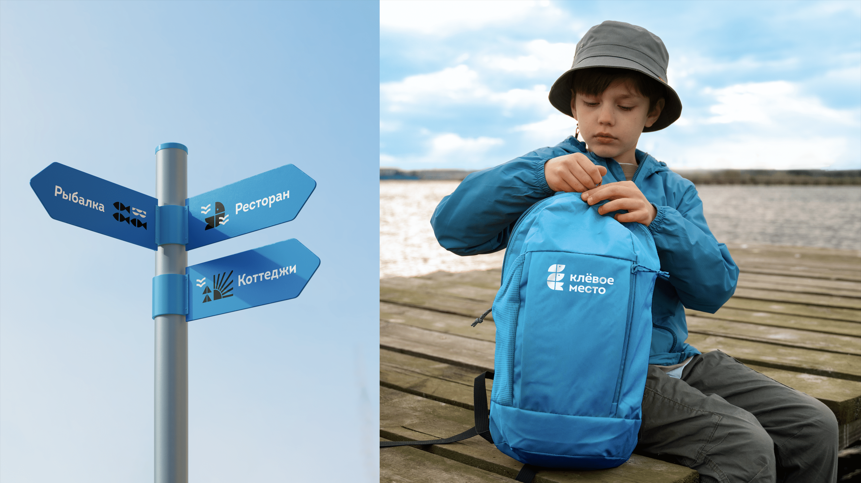 Айдентика должна была транслировать все виды активности, которые «Клевое место» предлагает гостям. Поэтому, разрабатывая элементы, мы выбирали объекты, которые связаны с отдыхом на природе. Так появились графичные растения, волны, солнце, стайка рыб.
