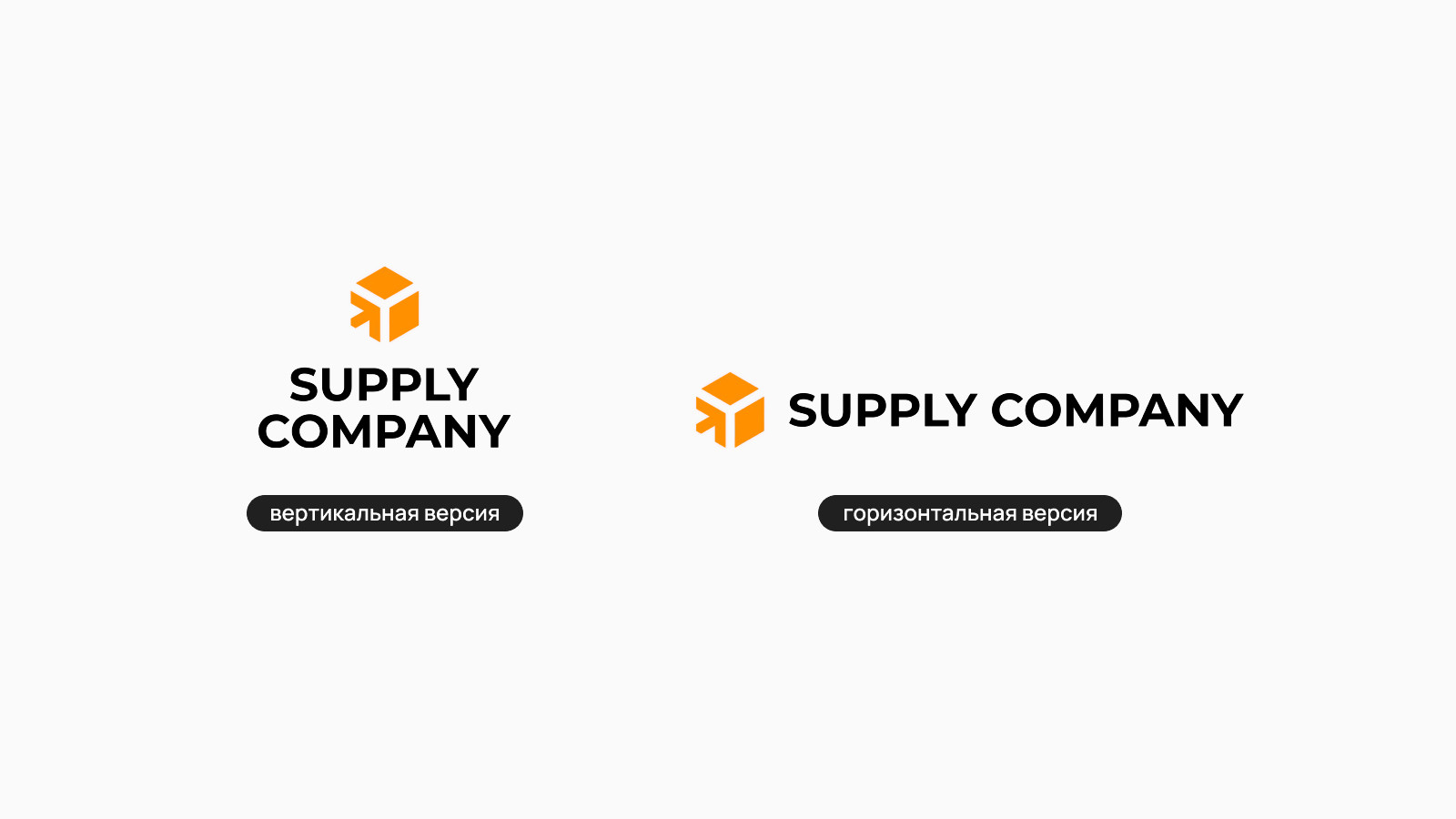 Supply Company — достаточно длинное название, которое сложно разместить на компактном носителе: придётся уменьшить логотип до нечитабельного размера. Чтобы этого избежать, дизайнеры разработали вертикальную версию логотипа — название компании пишется в две строчки.