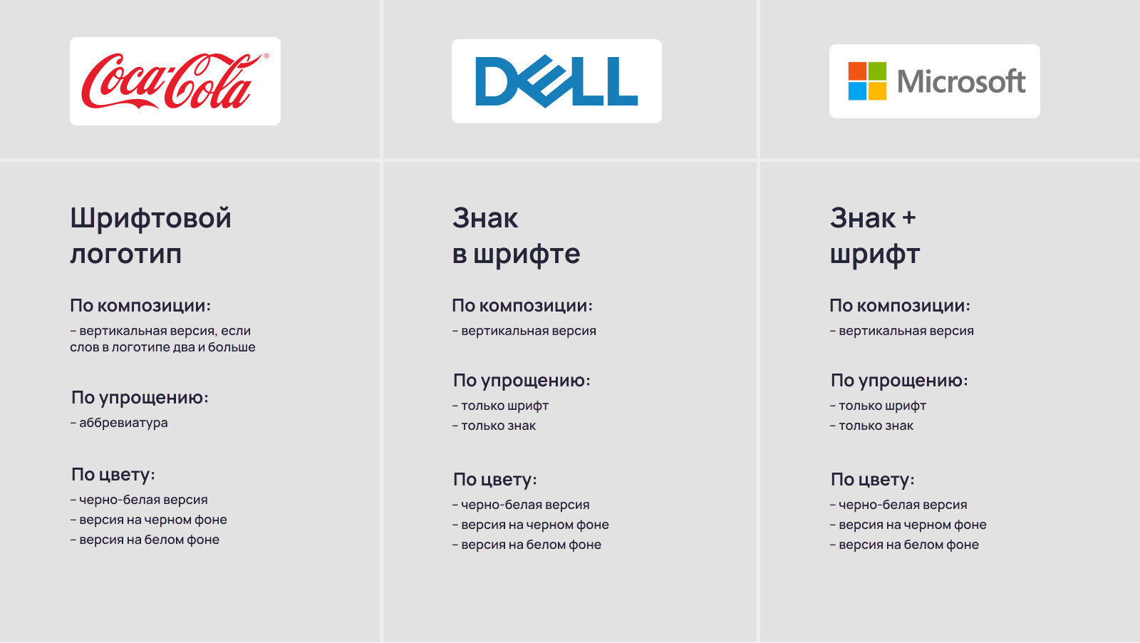 Чтобы было проще разобраться, мы поделили вариации логотипов на три условные группы: