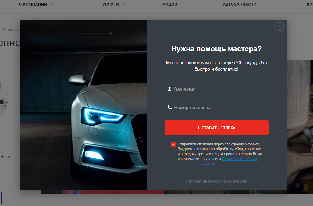 Использование Roistat бонусом позволит внедрить и дополнительные инструменты для генерации лидов (если конечно же вы уже не используете аналогичные). Это может быть «Ловец лидов». Удобный инструмент отслеживает движение посетителя мышью и время, проведенное на странице. Если посетитель попытается уйти, то система предложит ему что-то во всплывающем окне. Что предложить — решать маркетологу. Обычно это что-то типа: «не смогли найти этого-то — давайте перезвоним вам и поможем».