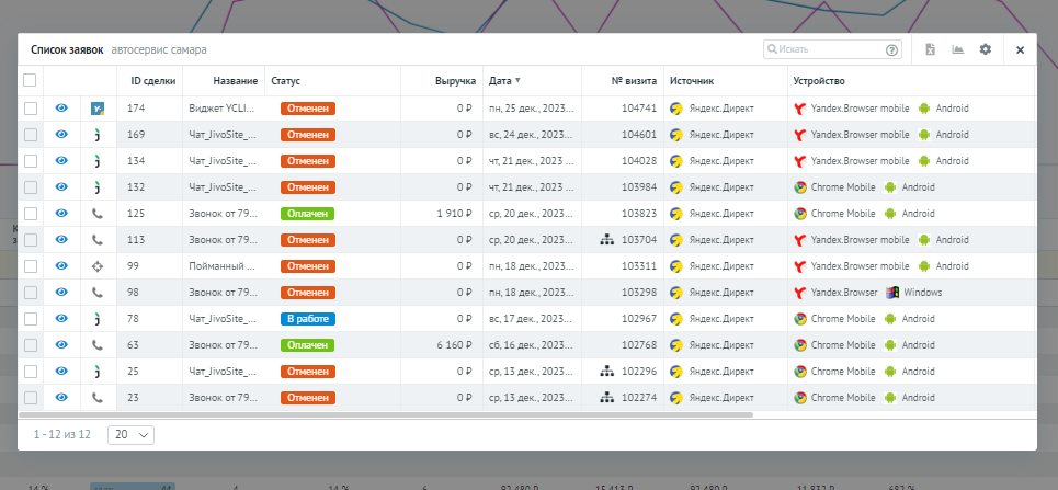 Из таблицы кликнув на число заявок мы можем получить список этих заявок: