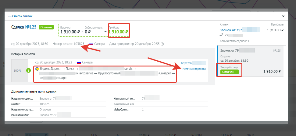 У нас есть расход на привлечение лида, и мы точно знаем, что в нашей кампании дало нам этот лид. После обработки лида он получает статус «Оплачен» или «Отменен», и менеджер вписывает сумму сделки. Теперь мы не только знаем, откуда появился лид и сколько мы потратили на его привлечение, но и сколько денег он нам принес в кассу. Думаем, дальше несложно понять, сколько возможностей дает такая статистика. Любой руководитель всегда задает вопрос: «Сколько денег нам это дало?». Располагая данными системы сквозной аналитики, интернет-маркетолог может точно ответить на этот вопрос!