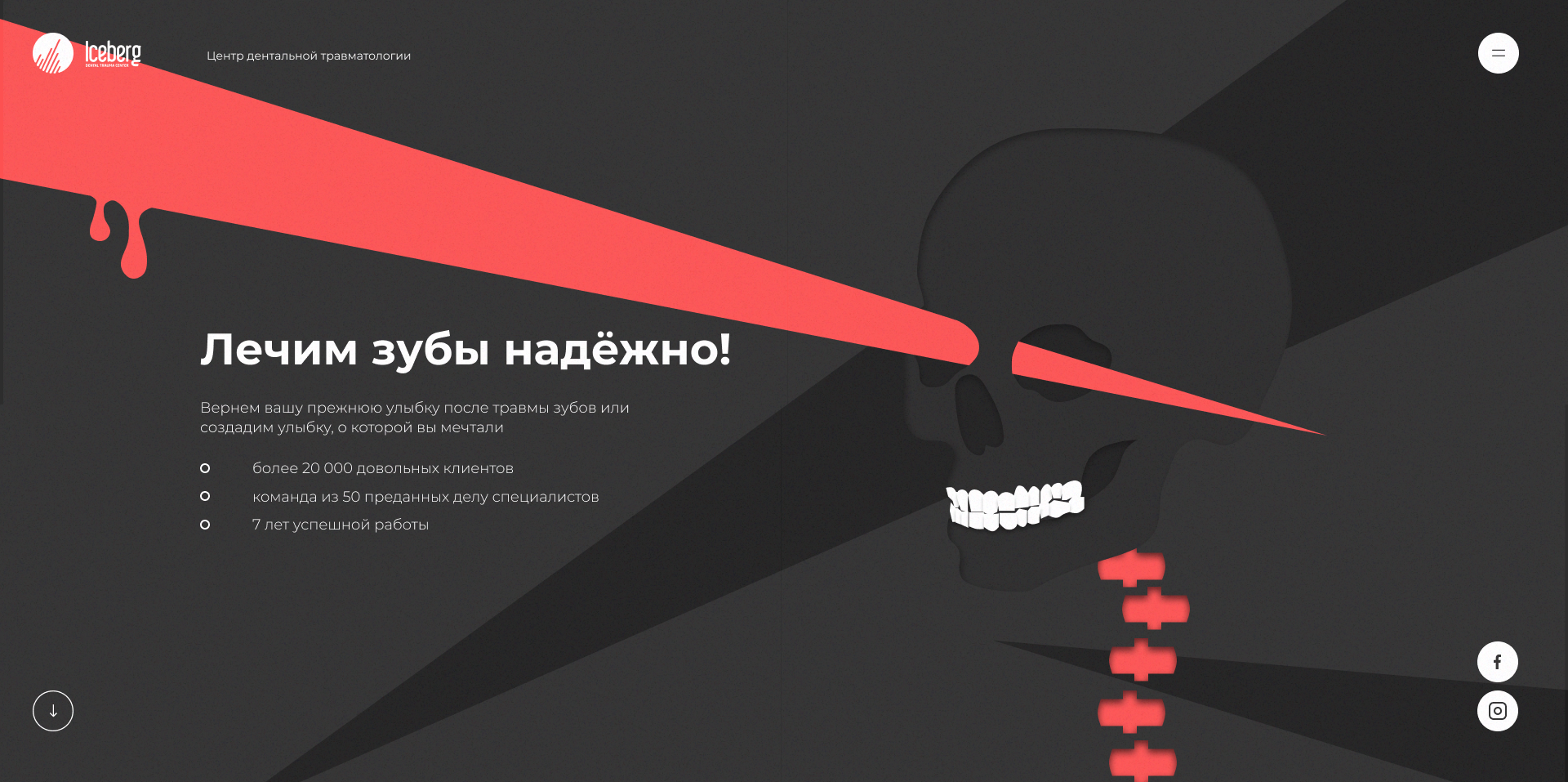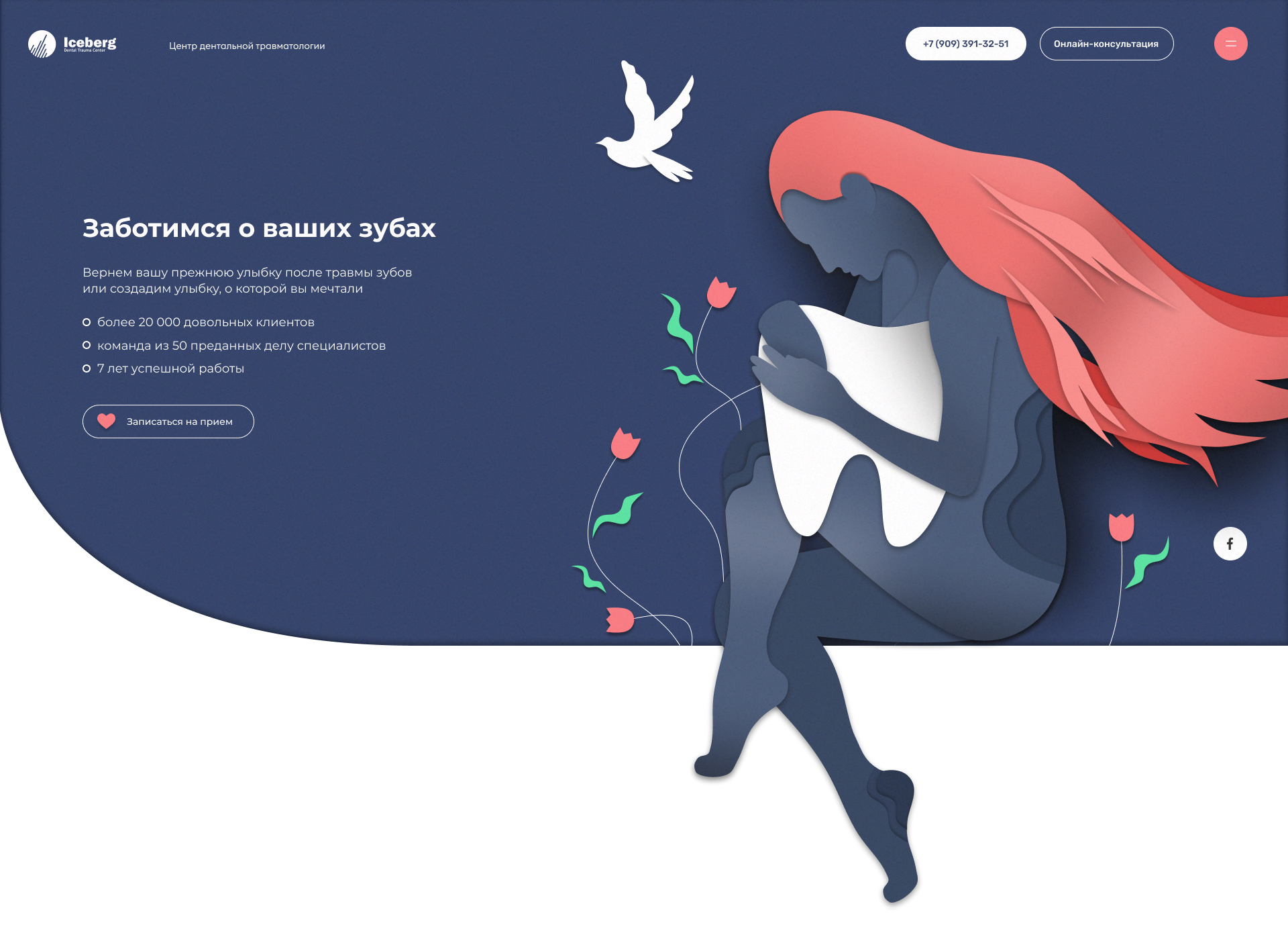 Нам нельзя было допустить конфликт между названием компании и креативом в дизайне. С одной стороны айсберг, как природный объект, напоминает зуб, а с другой стороны он ассоциируется со льдом и холодом, что не сочеталось с подходом в работе команды ICEBERG. Основатели компании и все врачи, персонал — сопереживательные, добрые люди, которые относятся к своему делу с любовью. Нам было важно нащупать грань между «айсбергом» и «любовью», то есть холодом и нежностью, и для этого мы спроектировали контрастные главные страницы для будущего сайта.