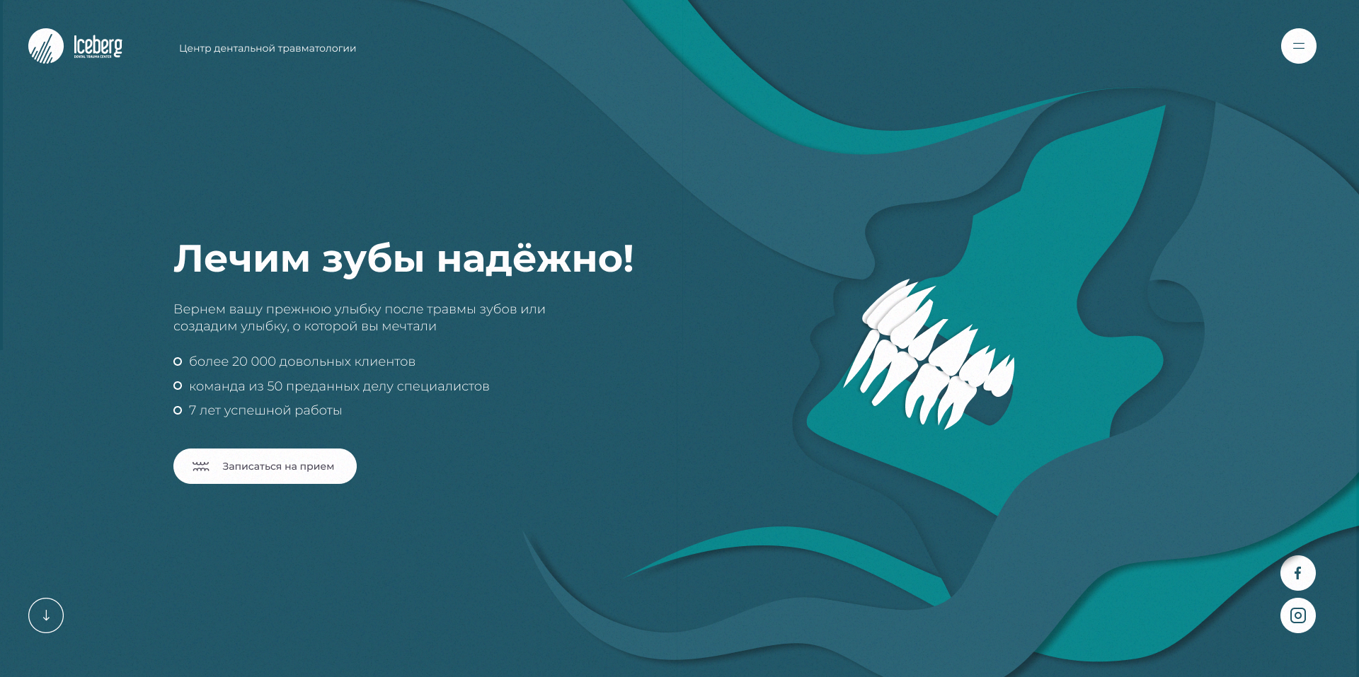 Мы вдохнули новую жизнь в проект, и сайт перешел к нам в руки. Мы продолжили двигаться в сторону 3D-форм. На главной странице сайта мы анимировали зуб возникающий из глыбы льда, что сочетается с названием компании.