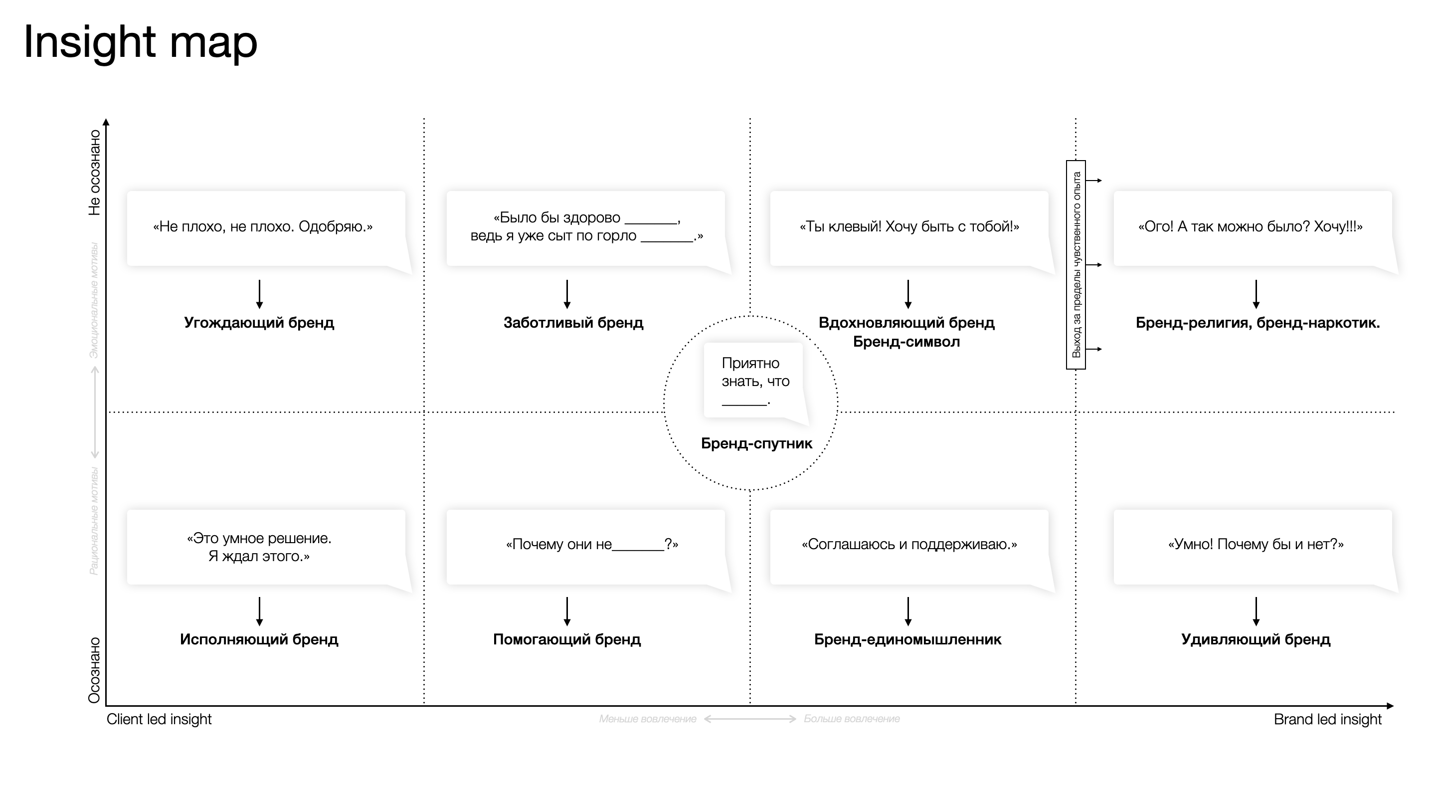 2. Инсайт для ИТ-продуктов не формируется так же, как для продуктов FMCG. Как уже было сказано ранее, цифровые продукты обладают слишком большим количеством ситуаций и сценариев потребления. С точки зрения бренда, каждая ситуация генерирует свой уникальный набор инсайтов. Попытаться объединить их в один общий инсайт, который будет удобен для построения позиционирования было бы ошибкой. Вместо этого, правильным подходом мы считаем разработку матрицы, описывающей разные роли бренда, которые меняются в зависимости от текущего сценария и инсайта.